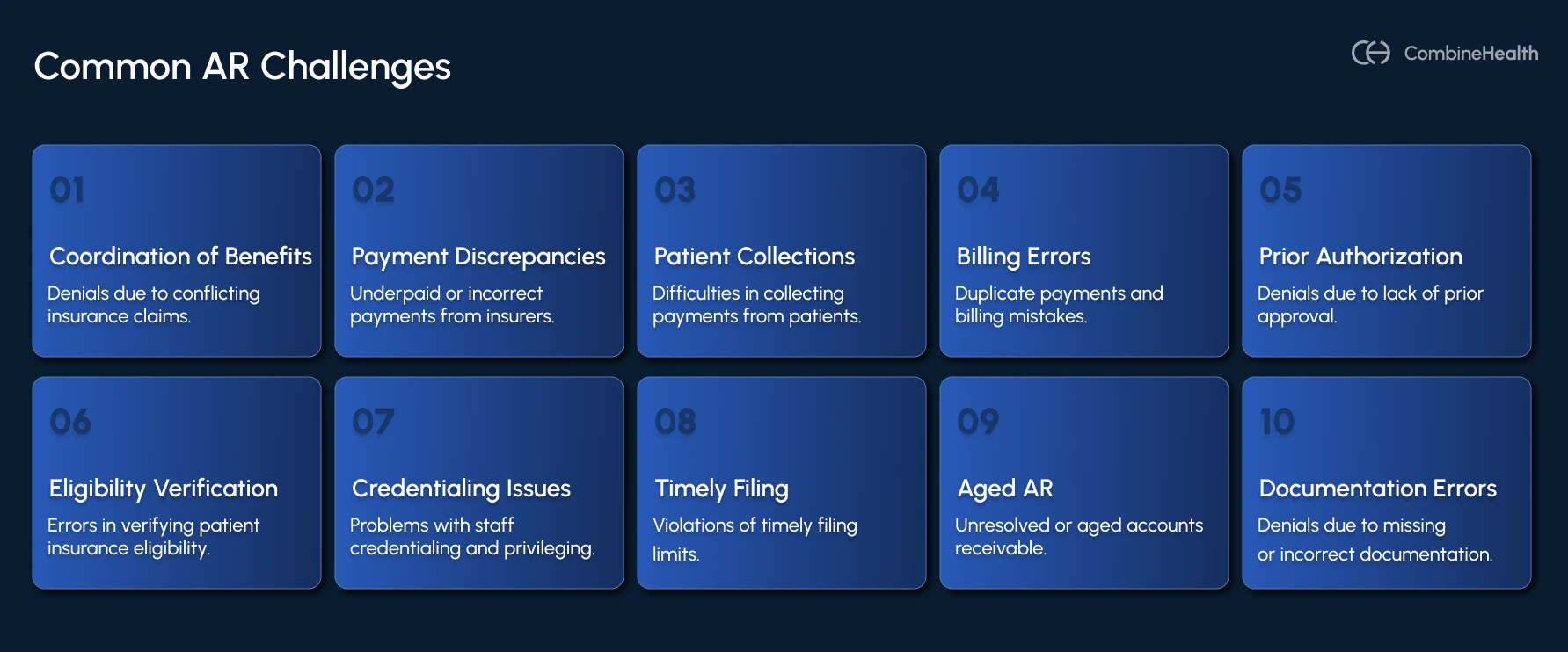 • Top AR issues are denials, underpayments, eligibility/COB errors, documentation gaps, timely-filing misses, and aged/unresolved claims.